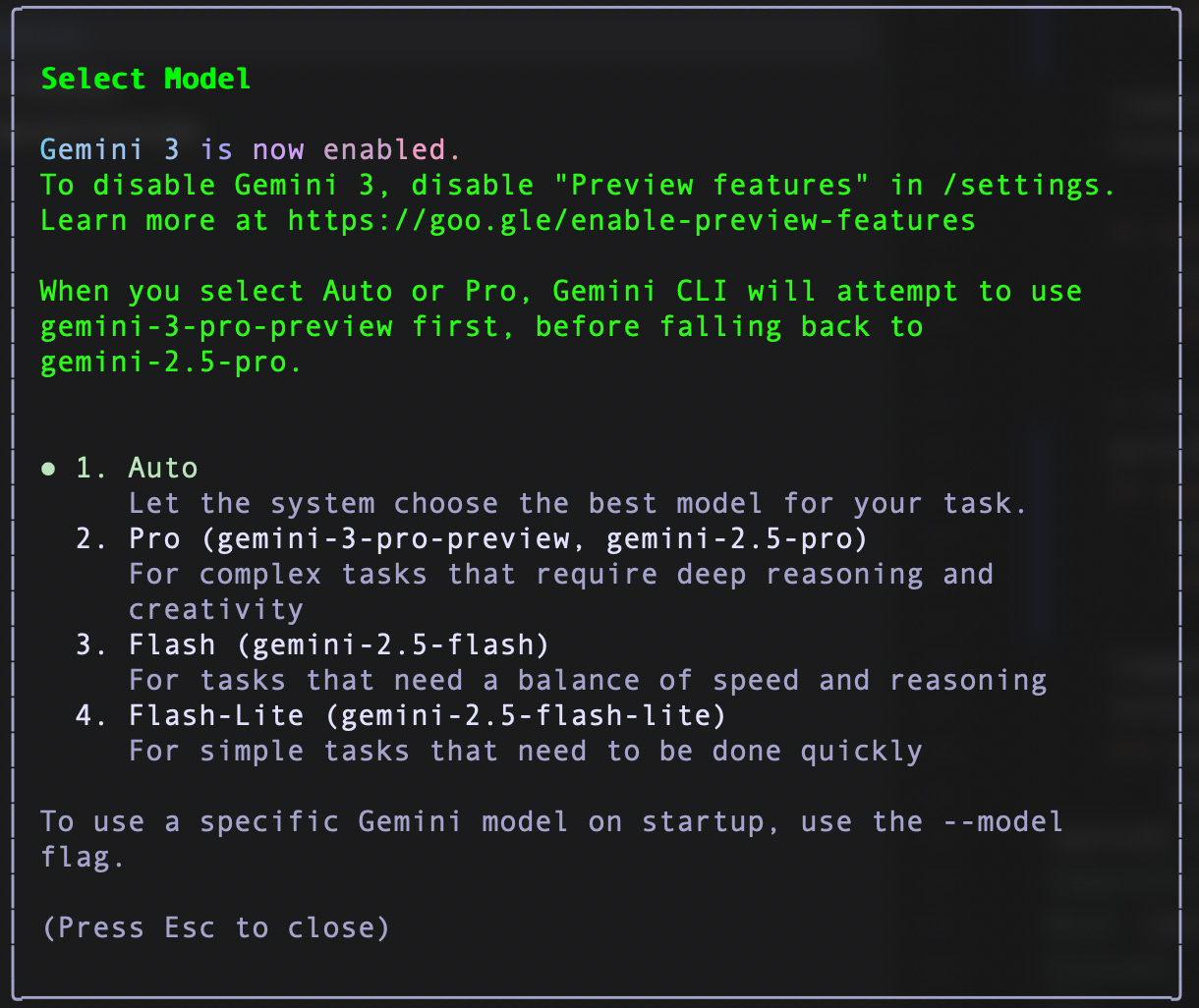 After installation it told me I could select models using the /model command, but in order to enable Gemini 3 Pro in a preview mode I needed to go to /settings and enable Preview features.