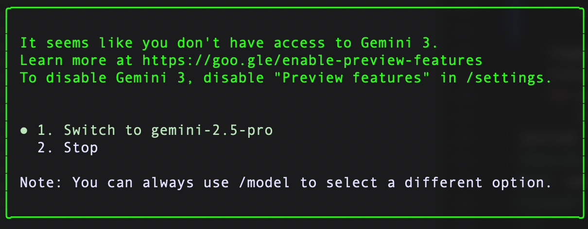 What’s more, the URL printed in the second line of the message is not selectable — I can’t just copy and paste it into a browser, instead I have to type it in manually to find out why I don’t have access to Gemini 3.